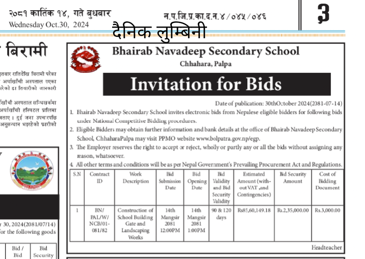 विद्यालय भौतिक निर्माणको विद्धुतीय बोलपत्र सम्बन्धी सूचना |