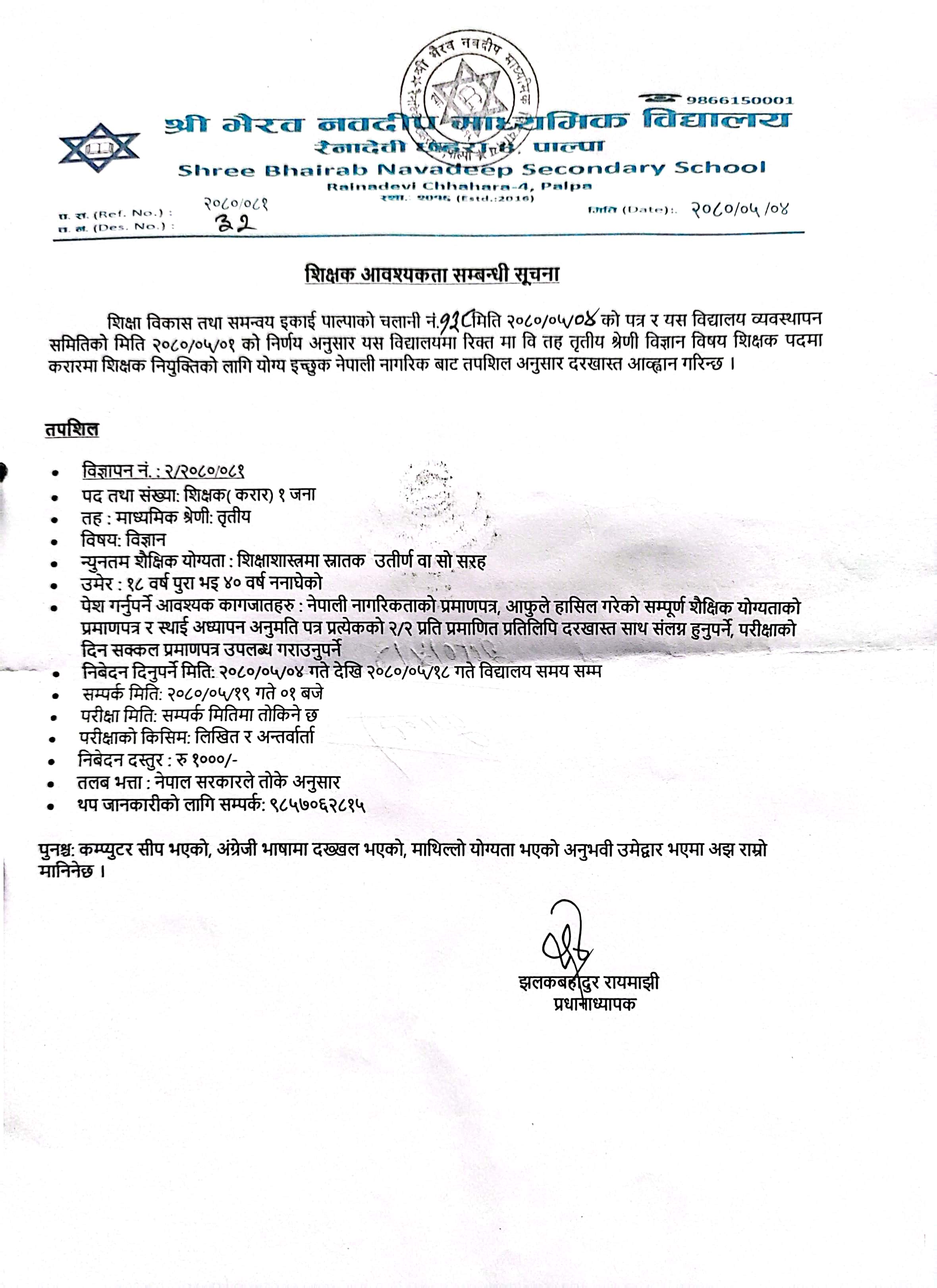 शिक्षक आवश्यकता सम्बन्धी सूचना |